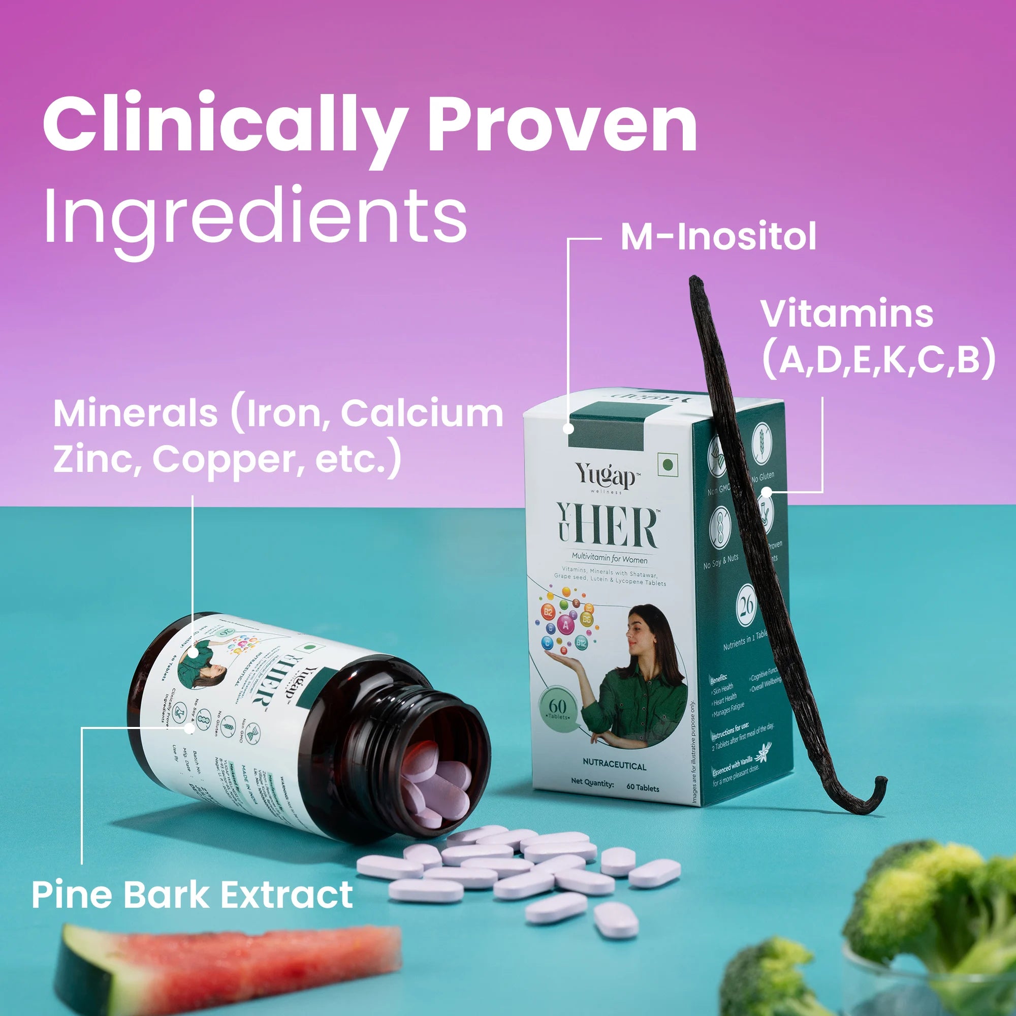 YuHer is a multivitamin crafted to meet the unique needs of women’s bodies. It supports hormonal health, energy levels, bone density, immune function, and skin radiance using essential vitamins, minerals, and botanical extracts like Shatavari and Grape Seed.
